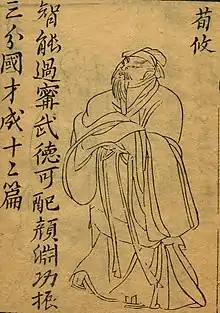 Xun You (157c.September 214), courtesy name Gongda, was a statesman who lived during the late Eastern Han dynasty of China and served as an adviser to the warlord Cao Cao.[2] Born in the influential Xun family of Yingchuan Commandery (around present-day Xuchang, Henan), Xun You was recruited into the civil service by the general He Jin. When the warlord Dong Zhuo hijacked and controlled the Han central government between 189 and 192, Xun You plotted with four others to assassinate him but was discovered and imprisoned. Following his release after Dong Zhuo's death, he wanted to serve as the Administrator of Shu Commandery (around present-day Chengdu, Sichuan) but eventually settled as an official in Jing Province.