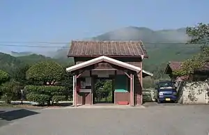 The station consists of two staggered opposed ground-level side platforms, connected by a level crossing. In the 1990s, the office side of the station building was dismantled, leaving only the waiting room. The station is unattended.