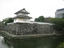 Yagura (櫓, 矢倉[1]) is the Japanese word for "tower", "turret", "keep", or "scaffold".[2] The word is most often seen in reference to structures in Japanese castle compounds but can be used in other situations as well. The bandstand tower erected for Bon Festival is often called a yagura, as are similar structures used in other festivals.[3] Yagura-daiko (taiko drumming from atop a yagura) is a traditional part of professional sumo competitions.[4]
