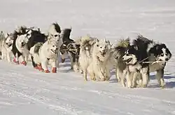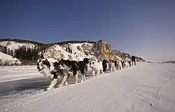 Yakutian Laikas are a breed with ancient origins developed by native Yakuts for hunting mammals and birds, herding livestock and hauling game back to camp.[6] The dogs were indispensable assistants and companions. In the Sakha language, this breed is known as "Sakha yta" meaning "Yakut dog". Evidence of this breed can be found in archaeological remains dating 12,500 years ago.[6] Remnants of dog sleds and harnesses has been found with dog remains in the Sakha republic radiocarbon dated to 7800–8000 years ago.[7]