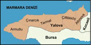 Yalova Province (Turkish: Yalova ili) is a province in northwestern Turkey, on the eastern coast of the Sea of Marmara. Its adjacent provinces are Bursa to the south and Kocaeli to the east. Its area is 798 km2 (making it the smallest province of Turkey),[2] and its population is 296,333 (2022).[1] Prior to 1930, the area around Yalova constituted a district of Kocaeli Province; from 1930 to 1995, it was part of Istanbul Province; in 1995, the area was separated and made into the current Yalova Province.[3][4] The provincial capital is the city of Yalova.