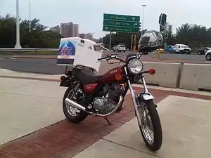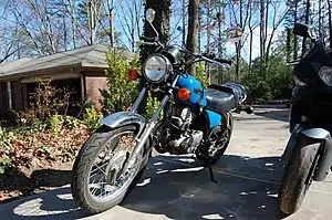 The SR250 was produced from 1980 to 1982 in the United States, as well as from 1982 to 2002 in Spain, in two versions. While it has stylistic similarities with its older brothers the SR500 and SR400, the SR250 is very much a commuter bike. In 1980 Cycle World's test of the SR250, called the Exciter I in the US with added high, cruiser style handlebars, found a standing 14-mile (0.40 km) time of 16.36 seconds at 122.89 km/h (76.36 mph), acceleration from 0 to 97 km/h (0 to 60 mph) of 11.5 seconds, and a top speed of 130 km/h (80 mph).[1] Braking distance from 60 to 0 mph (97 to 0 km/h) was 38 m (125 ft), and tested fuel consumption was 76 mpgUS (3.1 L/100 km; 91 mpgimp), giving a range of 269 km (167 mi).[1]