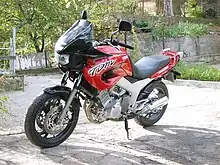 The Yamaha TDM is an 849 cc DOHC parallel-twin motorcycle that heralded the modern "Sport touring" category. The TDM was first manufactured by the Yamaha Motor Company of Japan in 1991. The TDM has a pressed-steel frame and a dry sump engine with five valves per cylinder, (three inlet and two exhaust).