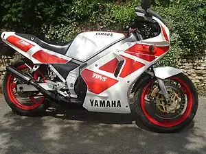 Yamaha produced the road going two-stroke motorcycle, loosely based on the TZ250 Yamaha racing bike. Parallel-twin, reverse cylinder and finally 90° V-twin variants were produced. It evolved as a natural replacement for the popular RD 250/Yamaha RD350LC series of the 1980s. It has the Yamaha Power Valve System 'YPVS' which raises and lowers the exhaust port depending on the rpm of the engine. The YPVS servo motor starts to open at about 6,000rpm. In standard form it produced 45 hp due to the restrictive standard exhausts and ignition boxes.[2]
