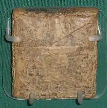 In all likelihoods Yamhad was a tribal name.[2] The dynasty entered the historic records when the founder Sumu-Epuh was mentioned as an enemy in the inscriptions of Yahdun-Lim of Mari.[3] Sumu-Epuh faced dangerous enemies most important of them was Shamshi-Adad I of Assyria and was killed in one of the battles.[4] His successor Yarim-Lim I was able to defeat all his enemies becoming a Great King,[2] his reign saw an alliance with Hammurabi of Babylon,[5] and the dynasty became the most influential family in the Levant with the armies of Yamhad campaigning as far away as Diniktum in southern Mesopotamia next to Elam borders.[6] Dynastic marriages played a part in the dynasty policy and included royal members of many kingdoms such as Ebla and Mari,[7] whose King Zimri-Lim was married to Shibtu the daughter of Yarim-Lim I.[8]