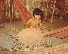 While the men hunt, the women and young children go off in search of termite nests and other grubs, which will later be roasted around family hearths. Each family has its own hearth where food is prepared and cooked during the day. At night, hammocks are slung near the fire which is stoked all night to keep people warm.[7] Although hunting accounts for only 10% of Yanomami food, among men it is considered the most reputable of skills and meat is greatly valued by everyone. No hunter ever eats the meat that he has killed. Instead he shares it out among friends and family.[8] In return, he will be given meat by another hunter.[5] Sometimes, the women also pursue frogs, land crabs, or caterpillars, or even look for vines that can be woven into baskets. While some women gather these small sources of food, other women go off and fish for several hours during the day.[9] The women also commonly use plants such as manioc to turn into flat cakes, which they cook over a small pile of coals.[6]
