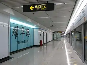Yaohua Road (simplified Chinese: 耀华路; traditional Chinese: 耀華路; pinyin: Yàohuá Lù) is an interchange station between Line 7 and Line 8 of the Shanghai Metro. It is located in the Shanghai Expo 2010 zone.