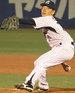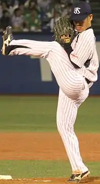 His unusual pitching form, most notably his leg kick, earned him the nickname "Ryan" for it was fashioned after the style MLB Hall of Famer Nolan Ryan.[21] Listed at 171 cm (5 ft 7 in), he may lack the advantage of having longer limbs for extra power, but his form has a slower rhythm to it, making his pitches more difficult to time.[4][22] With an overhand delivery, he throws a four-seam fastball typically at high-80s mph (tops out at 150 km/h or 93 mph).[23] He can throw decent two-seamers and cutters, sliders, and forkballs.[24]