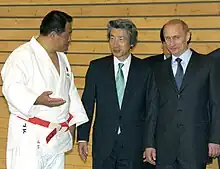 Yamashita served as an instructor for numerous organizations before becoming the International Judo Federation's Director of Education in September, 2003. His presence as the head coach of the Japanese judo team was felt when he strongly protested the controversial decision in a match between David Douillet and Shinichi Shinohara at the 2000 Summer Olympics.[5] Yamashita has also compiled an instructional judo video with Russian President Vladimir Putin, who also holds a black belt in judo.[6] The two first met during Putin's visit to Tokyo in 2005, and Yamashita has traveled to St. Petersburg to visit the President's former judo school.[6] He is the chairman of the Japanese Olympic Committee, and on 10 January 2020 he was elected a member of the International Olympic Committee.[7] In 2022 he was promoted 9th dan.[8]