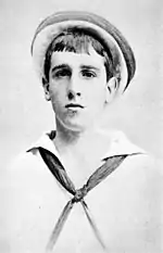 As a boy living in Baltimore's upper west side, Stirling attended public schools where, despite a professed dislike of physical combat, he had a reputation of being a fighter.[7] While his father was at sea for as long as three years at a time, Stirling had a happy home life with a mother that instilled a love for reading and provided private teachers that enabled him to skip grades at school, though Stirling admitted he was not a good student.[8] During his father's cruise absences, the family's only knowledge of his well-being came in bulky packets of letters arriving in bunches over long intervals that Stirling's mother, Ellen, would read aloud to her children. The exciting details of life on a warship—"gales, tropical coral reefs, savage people, hunting, and yellow fever"—influenced Stirling's desire for the naval life.[9] But he saw that it was not without sacrifice. A younger brother was about three when Stirling's father left Baltimore for a long cruise. A few months later, the boy contracted diphtheria and died. Another younger brother, Archie, was born shortly after that. Yates Stirling Jr. wondered how his father must have felt when he returned home and saw a new son that was nearly the same age as the one he had lost.[10]