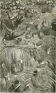 | Illustration from Hartwig & Hudson (1874) showing nest of yellow-capped weaver at bottom center | |
