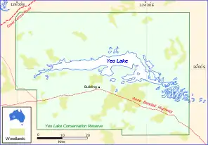 Yeo Lake is an ephemeral salt lake in the south of Western Australia, lying in the Great Victoria Desert east of Cosmo Newberry.[1] The Anne Beadell Highway runs along its southern margin, and the Great Central Road lies further to its north. Its surface elevation is 349 metres above mean sea-level.[2]