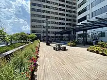 A revitalization project completed in 2016 saw 7 floors added to 2300 Yonge Street and 5 floors added to 20 Eglinton Avenue West, as well as re-cladding the towers with curtain wall glass. A new publicly-accessible rooftop patio and green wall were also installed.[1][2]