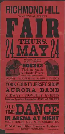 The society was reformed in 1874 as the Richmond Hill and Yonge Street Agricultural Society.[1] The last spring fair in Richmond Hill was held in 1996.[3] By this point, Richmond Hill was suburban and no longer had enough agriculture in the community to support a fair.