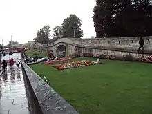 The section of York city walls near Lendal Bridge at approximately the original planned location of the City War Memorial; the North Eastern Railway Company's memorial can be seen in the background to the left.