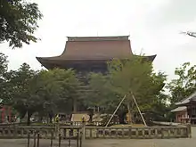 The most well-known area within the town is Yoshino Mountain, famous for its many thousands of sakura trees; much poetry has been written on the subject by several famous authors, including Chiyo and Uejima Onitsura.[1] These flowering cherry trees were planted in four groves at different altitudes, in part so that the trees would be visible coming into bloom at different times in the spring. An account of Yoshino written in about 1714 explained that, on their climb to the top, travelers would be able to enjoy the lower 1,000 cherry trees at the base, the middle 1,000 on the way, the upper 1,000 toward the top, and the 1,000 in the precincts of the inner shrine at the top.[2]