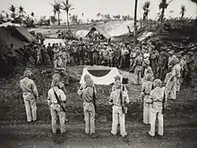 The Battle of Saipan began on 15 June 1944. Without possibility of resupply, the situation was hopeless for the defenders, but Saito was determined to fight to the last man, as he was aware that the fall of Saipan would place the Japanese archipelago within range of American strategic bombers. The Japanese used the many caves in the volcanic landscape to delay the attackers, by hiding during the day and making sorties at night. The Americans gradually developed tactics for clearing the caves by using flamethrower teams supported by artillery and machine guns. On July 6, he called for a gyokusai saying roughly "Whether we attack or whether we stay where we are, there is only death. However, in death there is life. I will advance with you to deliver another blow to the American devils and leave my bones on Saipan as a fortress of the Pacific".[2] By 7 July, the Japanese had nowhere to retreat.[3] Over Nagumo's objections, Saito made plans for a final suicidal banzai charge. On the fate of the remaining civilians on the island, Saitō said, "There is no longer any distinction between civilians and troops. It would be better for them to join in the attack with bamboo spears than be captured."[4] But by 16:15 on 9 July, American commander in chief Admiral Turner announced that Saipan was officially secured. Saitō, wanting to avoid capture and dishonor, committed seppuku in a cave at dawn on 10 July, with his adjutant shooting him in the head after he had disemboweled himself.[5] Saitō was given a funeral with military honors by his American counterpart Holland Smith.[6]