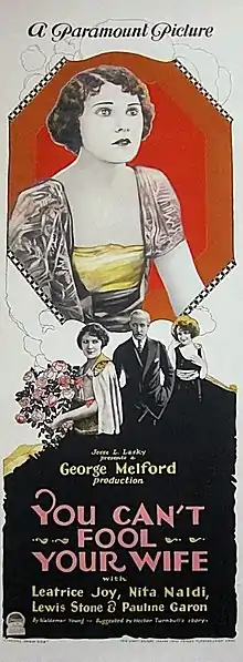 You Can't Fool Your Wife is a lost[1][2] 1923 American silent drama film directed by George Melford and written by Waldemar Young. The film stars Leatrice Joy, Nita Naldi, Lewis Stone, Pauline Garon, Paul McAllister and John Daly Murphy. The film was released on April 29, 1923, by Paramount Pictures.[3][4]