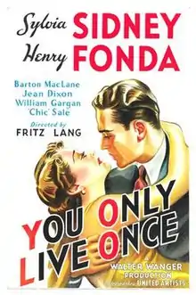 You Only Live Once is a 1937 American crime drama film directed by Fritz Lang and starring Sylvia Sidney and Henry Fonda. Considered an early film noir,[3] the film was the second directed by Lang in the United States.[4] At least 15 minutes were trimmed from the original 100-minute version of the film due to its then unprecedented violence.[5] Despite the removal of such scenes, the film is widely considered an early film noir classic.[6] The film is also known for being one of the first box-office bombs.