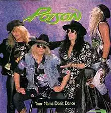 In 1988, the glam metal band Poison recorded a cover of "Your Mama Don't Dance." It appeared as the ninth track on their second album Open Up and Say...Ahh! by Capitol Records and was released as the album's fourth single. The Poison version reached number 10 on the Billboard Hot 100 and number 39 on the Mainstream rock charts and has since gone Gold in the US. The song also charted at number 21 on the Australian charts and number 13 on the UK Singles chart.[7] The single's B-side is "Tearin' Down the Walls".