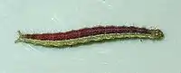 The wingspan is 18–23 mm. The head and thorax are white, patagia deep brown. Forewings with apex very strongly falcate; deep ochreous-brown, lighter towards costa anteriorly ; a light yellmv dorsal streak from base to tornus, edged above by a fine white line which is posteriorly bent obliquely upwards to disc at 2/3. Hindwings are rather dark grey. The larva is pale yellowish-green ; dorsal stripe broad, brown-reddish.[1]