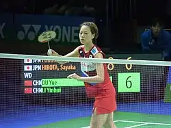Yuki Fukushima (福島 由紀, Fukushima Yuki, born 6 May 1993) is a Japanese badminton player affiliated with Marusugi Bluvic.[1][2] She and her partner Sayaka Hirota won the 2017 Most Improved Player of the Year award.[3] The duo were ranked as world No. 1 at the BWF World Ranking in 21 June 2018.[4]