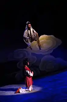 Carp spirit (bottom) chastised by Guanyin, from a 2014 Yue opera performance.