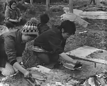 The Nunivak Eskimos (Nuniwarmiut in Cup'ig, Nunivaarmiut in Yup'ik and Cup'ik) eat frequently in the course of a 24-hour period. They go to bed at sundown or early evening in the spring and fall, and well before sundown in summer, but arise early, often at 3:00 or 4:00 a.m. and regularly at 5:00 or 5:30. The time of rising depended on the sea tide and the time when tomcod or other fish are running. The first meal of the day is eaten at this time and another about 11:00 a.m., with snacks once or twice in between depending on the work schedule and the availability of food. The evening meal is usually at 4:30 or 5:00 p.m. with additional snacks between the main meals. In winter the entire meal schedule is likely to be moved forward, with the first meal of the day being eaten at 10:00 or 10:30 a.m. The most common food is dried or frozen fish dipped in seal oil. The evening or late afternoon meal, the hot meal of the day, frequently consisted of boiled fish or other boiled food and tea.[7]
