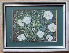 From 1985 she was part of the 8+1 Suffolk Group, a group of nine artists that teamed up together to manage and present their own exhibitions. Their first show was at Broughton Gallery, Lanarkshire in August 1985. Her main subjects were landscapes and seascapes celebrating the Suffolk countryside, along with still life pictures of flowers, plants and trees, including those growing in her own garden; she also produced occasional portraits. Her work was mainly figurative, although her later works were much more abstract in character, using vivid colours and broad brushstrokes. She is mentioned in Patrick Trevor-Roper's influential book The World Through Blunted Sight: An inquiry into the influence of defective vision on art and character (1970) as having different colour perception in each eye.[7] Her works are rarely titled, and whilst the landscapes are clearly recognisable, they are not usually particularly well-known views, although she did paint Snape Maltings and Shingle Street. She was highly commended in the 1994 Laing Art Competition. She generally worked from life and travelled around Suffolk and Norfolk in a Fiat 238 camper van seeking suitable subjects.
