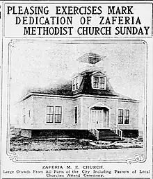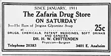The area cites 1913 as its date of founding; by that time, the area contained numerous businesses and even a newspaper. It was one of a handful of "wet" cities in Los Angeles County in the 1910s.[5] By 1919 it supported several small factories and a jitney bus up and down Anaheim Avenue.[2] There was a domestic violence murder-suicide in front of "an electric train crew and passengers" at Zafaria station in 1919.[6] There was a Zaferia branch of the Long Beach Public Library at 3351 East Anaheim Street.[2] This branch was later known as either Zaferia or East Long Beach until the 1924 establishment of the "first East Long Beach branch building owned and built by the city" on Freeman Avenue.[3]