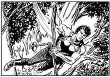 Although capable of near-superhuman feats, there were rare instances when Zagor was bested by certain extraordinary individuals. In a contest of skill (trials of power, speed, reflexes, marksmanship, breath-diving and beast-fighting) against multi-talented villain Supermike, Zagor is forced into a seventh round tie-breaker - a life-or-death duel atop of a small platform surrounded by the garden of spikes and daggers (which he, eventually, wins convincingly while even managing to spare the life of an opponent).