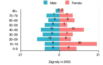 According to the 2002 Poland census, there were 146 people residing in Zagrody village, of whom 47.9% were male and 52.1% were female. In the village, the population was spread out, with 26.7% under the age of 18, 36.3% from 18 to 44, 15.8% from 45 to 64, and 21.2% who were 65 years of age or older.[1]