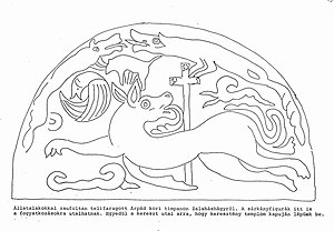 The scenario of the tympanon is a fight between two dragons. There very few such stone carvings in Western Eurasia. We know such tympanon in Sopron, St. Jacob chapel and also on the Attila sword, a sword from the Árpád dynasty age, and in exhibition in Vienna.