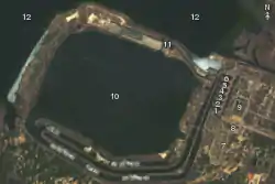 The spent nuclear fuel is stored in cooling pools inside the reactor containments for up to five years. It is then transferred to an on-site dry cask storage facility that was commissioned in 2004.[11][12] The reactors and spent fuel pools depend on water from the Kakhovka Reservoir for cooling. The reservoir is created by the Kakhovka Hydroelectric Power Plant dam, which is a main conflict location of the two war participants.[13][14]