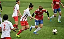 Zehra Borazancı (red/blue) of Adana İdmanyurduspor challenging an attack of Ataşehir Belediyespor in the 2014–15 Turkish Women's First League.