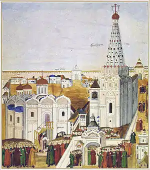 On March 2, an embassy under the leadership of the Ryazan archbishop Feodorit Troitsky was sent to Mikhail Romanov and his mother on behalf of Zemsky Sobor to Kostroma. The embassy included archimandrites of the Chudov, Novospassky, Simonov monasteries, the boyars Fyodor Sheremetev, Vladimir Bakhteyarov-Rostovsky, boyar children, and orderly people elected from cities.[3] The purpose of the embassy was to inform Michael of his election to the throne and to give him a Sobor oath. According to the official version, Mikhail was frightened and flatly refused to reign, so the ambassadors had to show all their eloquence to convince the future king to accept the crown. Critics of the "Romanov" concept express doubts about the sincerity of rejection and note that the conciliar oath has no historical value: