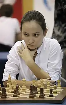 During 2013, Abdumalik crossed ratings of 2200 and 2300 for the first time.[11] She entered the Kazakhstani women's national championship and finished runner-up to Guliskhan Nakhbayeva, who won on the tiebreak criteria after they both scored 7/9.[6][24] She also entered the open section of the under-20 junior national championship and won both the rapid and blitz events.[6][25][26] Later in the year, Abdumalik had a breakthrough at the World Junior Championships in Turkey. She won the silver medal as a 13-year-old with a score of 9½/13, a point behind only Aleksandra Goryachkina, one of the two players she lost to in the event. Among the players Abdumalik defeated in the event was Deysi Cori, a WGM rated 2433.[27][28][29] With this achievement, she earned her second WGM norm and was later named the Best Girl Under-20 at the 1st Annual Asian Chess Excellence Awards.[22][30] Late in the year, Abudmalik had another big achievement, winning the Brno Open in the Czech Republic as the sixth-highest rated player in the event. She scored 7½/9, a full point ahead of the two highest-rated players, Toms Kantāns and Vojtěch Plát, who came in joint second with several others.[31][32] Abdumalik began 2014 by achieving her final WGM norm at the Gibraltar Chess Festival in February. She scored 5½/10 against opponents with an average rating of 2366, notably defeating Felipe El Debs, a GM rated 2520.[33] As she had already reached the 2300 rating threshold, she earned the WGM title less than a month after turning 14 years old.[22] She had another successful result in speed chess later in the year, winning the bronze medal in 2014 Asian Women's Blitz Championship behind gold medallist Tan Zhongyi and silver medallist Dronavalli Harika.[34] Her career-best rating during the year was 2379.[11]