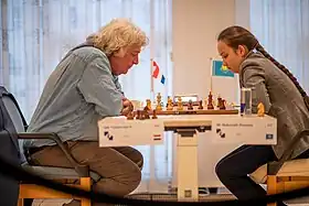 The following year, Abdumalik earned her final two GM norms in succession at the Karpos Open in March and the Budapest Spring Festival in April.[58][59] She scored 7/9 at the former event to finish in fifth place.[60] At the latter event, she was in contention for first place after starting with a score of 6/7 and defeating Tamás Bánusz, a GM rated 2617, but lost her last two games.[61] With all three norms, she only needed to reach a rating of 2500 to earn the GM title. She came close to reaching 2500 at her next tournament, the Open Internacional Llucmajor in Spain. Having started the event with a rating of 2484, she peaked at an unpublished rating of 2496.5 in the middle of the event before losing her next two games, the first to G.A. Stany.[62] Later in 2018, Abdumalik entered her first Women's World Chess Championship, which was played as a 64-player knockout tournament at the time. As the 15th seed, she made it to the quarterfinals. All four of her matches went to tiebreaks. Abdumalik won the first three matches against 50th seed Padmini Rout, 18th seed Zhao Xue, and 31st seed Jolanta Zawadzka in the first set of tiebreaks, played in a 25+10 rapid format.[lower-alpha 3][63] She then was eliminated by 7th seed Mariya Muzychuk. Both players each won once in the two-game classical match, the 25+10 rapid pair, and the 10+10 rapid pair before Muzychuk advanced by winning their first blitz game and drawing the other.[64][65][66][67][68]