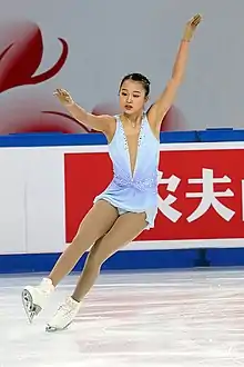 The performances drew considerable criticism from Weibo users, who also questioned her privileged background and family ties, lack of fluency in Mandarin Chinese, and selection over a native athlete.[29][3] False rumours also spread that she would rather be interviewed by CNN than Chinese media.[30] Following this, the microblogging company took steps to censor the backlash towards her and related hashtags.[31][32][33] In the women's event later on, Zhu finished 27th in the short program and did not advance to the free skate.[23][34] The performance however drew cheers and applause from the crowd midway through, and reportedly more sympathy on Weibo.[35] In a Chinese media interview afterwards, Zhu said there might have been online comments that affected her at first, but she later adjusted.[36]