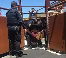 In April 2018, she chained herself in protest to a slaughterhouse gate on the campus of the California Polytechnic State University, San Luis Obispo in an attempt to rescue a cow.[8] Rosenberg and a 31-year-old women were arrested by university police who later issued them temporary stay-away orders.[8] Rosenberg's mother was also arrested for allegedly contributing to the delinquency of a minor.[8] No charges were filed by police.[9] Rosenberg organized additional protests against the University aimed to shut down the on-campus slaughterhouse.[9]