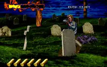 The player travels through five stages and must shoot zombies and other monsters along the way before being hit by their attacks (gunshots, knives, axes, etc.). Innocent bystanders appear frequently; if they are shot, the player suffers a health penalty. Pieces of the scenery such as gravestones and windows can be destroyed to reveal weapon power-ups and bonus items. The player starts the game with a standard handgun, but stronger weapons such as shotguns, machine guns, and fire rifles can be found; however, if the player is hit or shoots a bystander, any weapon power-ups are lost. The player's controller is a pump-action shotgun mounted to the cabinet. When a weapon's ammunition supply runs out, the player must pump the fore-end to reload.