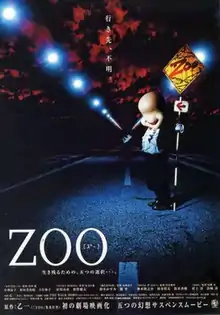 Zoo (ズー) is a 2005 Japanese horror anthology film directed by Ryu Kaneda and written by Otsuichi, based on the latter's Zoo series of short stories.[1][2] The film stars Patrick Harlan, Yui Ichikawa, Ryūnosuke Kamiki, Ryōko Kobayashi and Miyuki Matsuda in the lead roles.[3]
