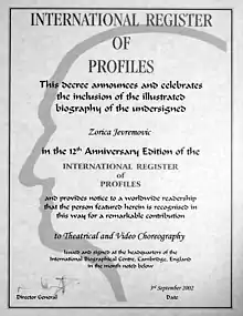 International Biographical Centre, Cambridge, England, remarkable contribution to Theatrical and Video Choreography, 2002