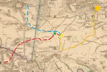 British movements shown on a contemporary map. 2nd Division in red, Wood's flying column in blue. Location of Zungeni Mountain in yellow and Fort Newdigate in green. Onward movements to Ulundi in orange.