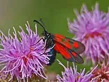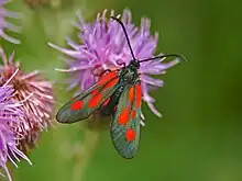 This species is very similar to Zygaena osterodensis, but in the latter the five red spots are almost always confluent into each other forming two parallel stripes. Moroeover in Z. osterodensis the apex of the forewings is pointed.[5]